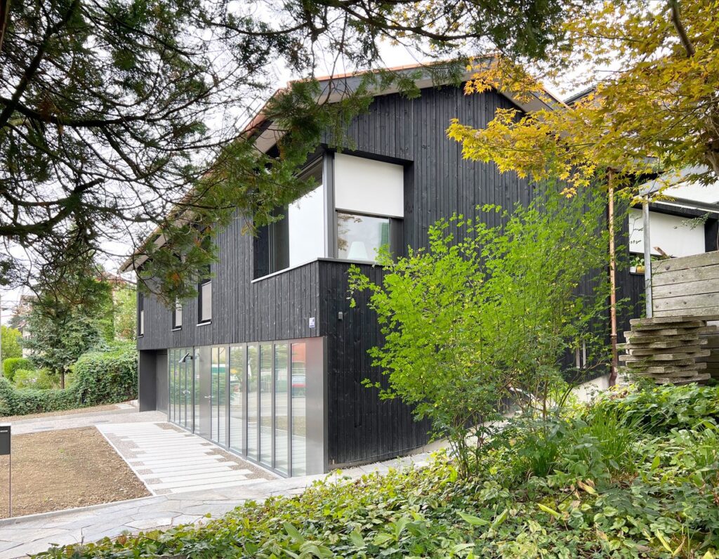 Modernes Einfamilienhaus, das in Elementbauweise aufgerichtet wurde.