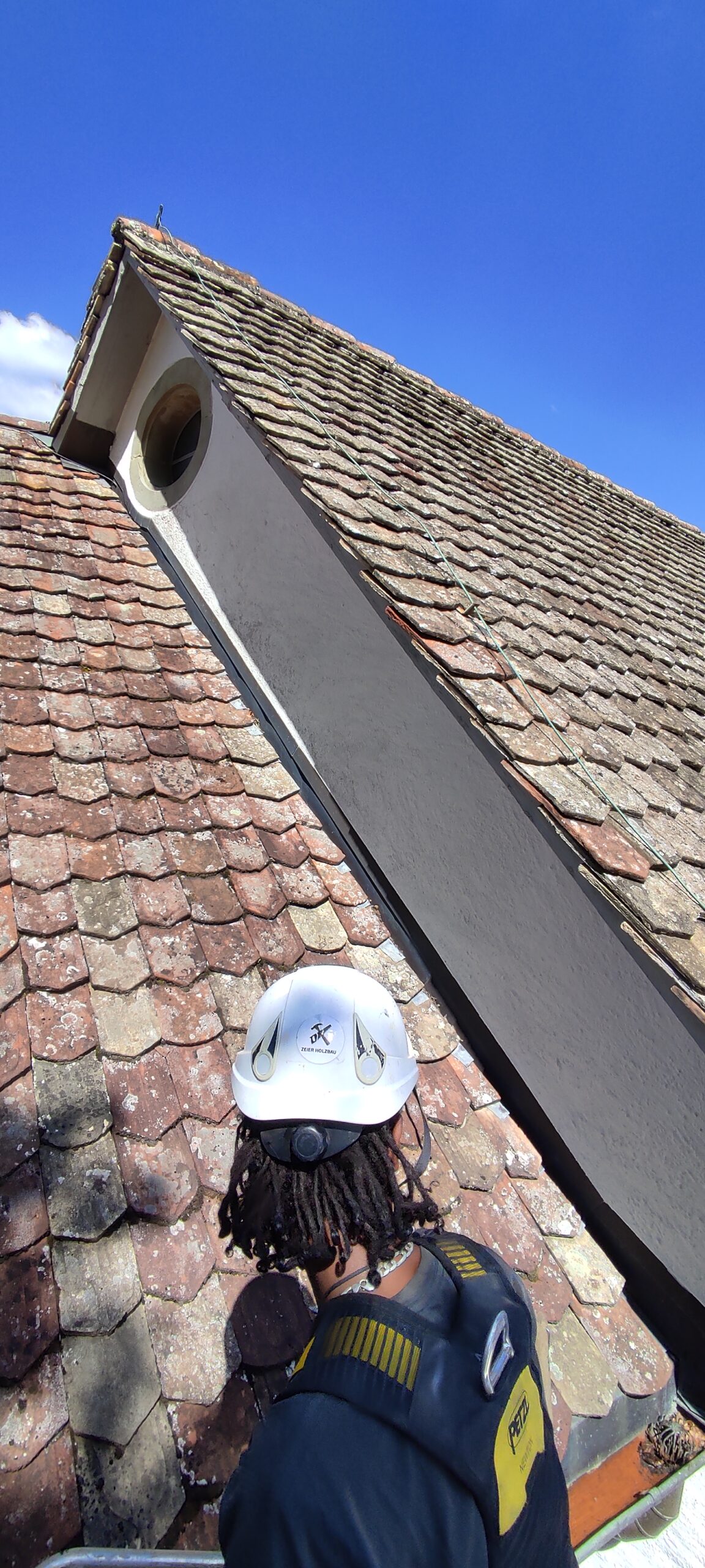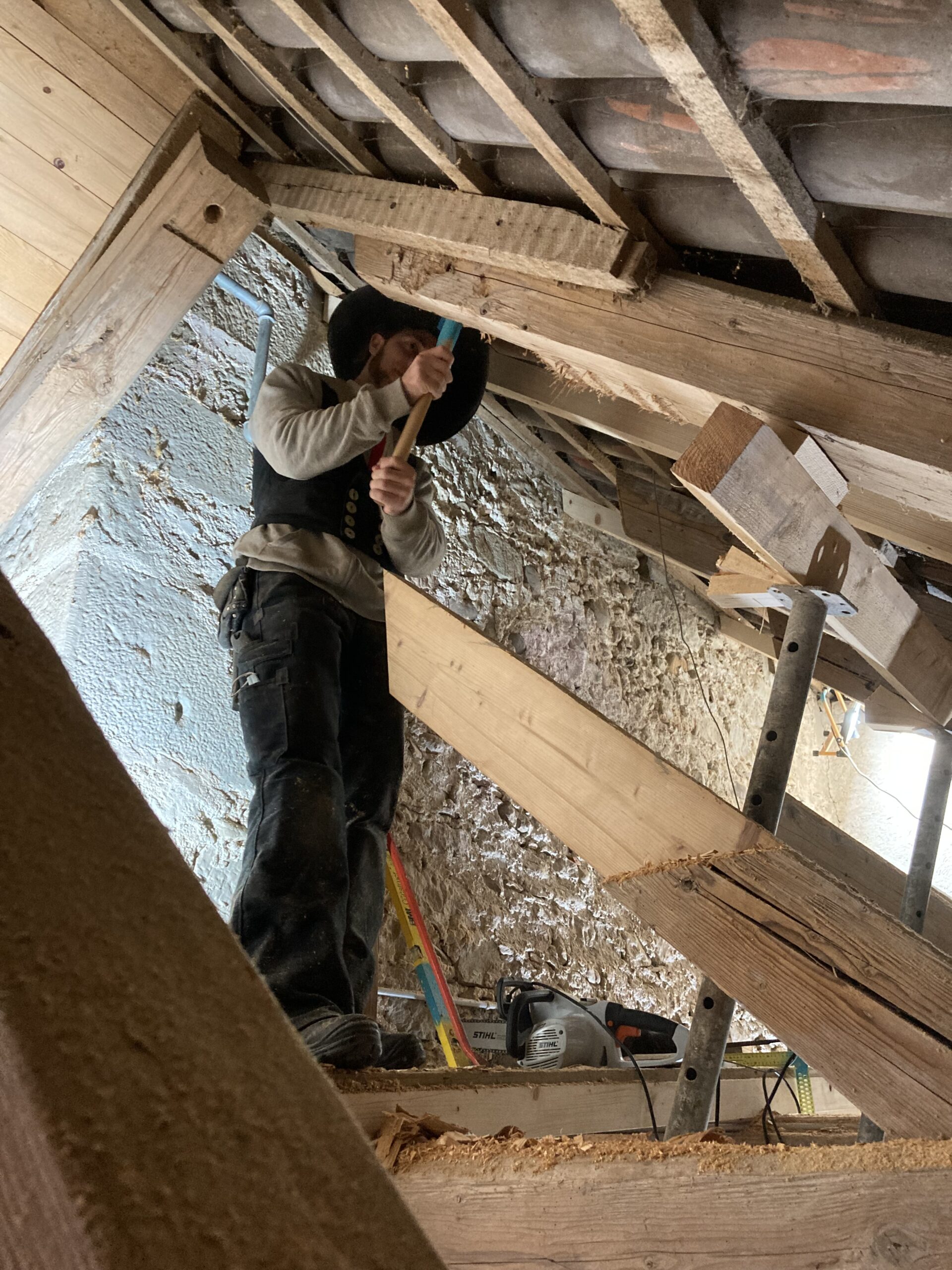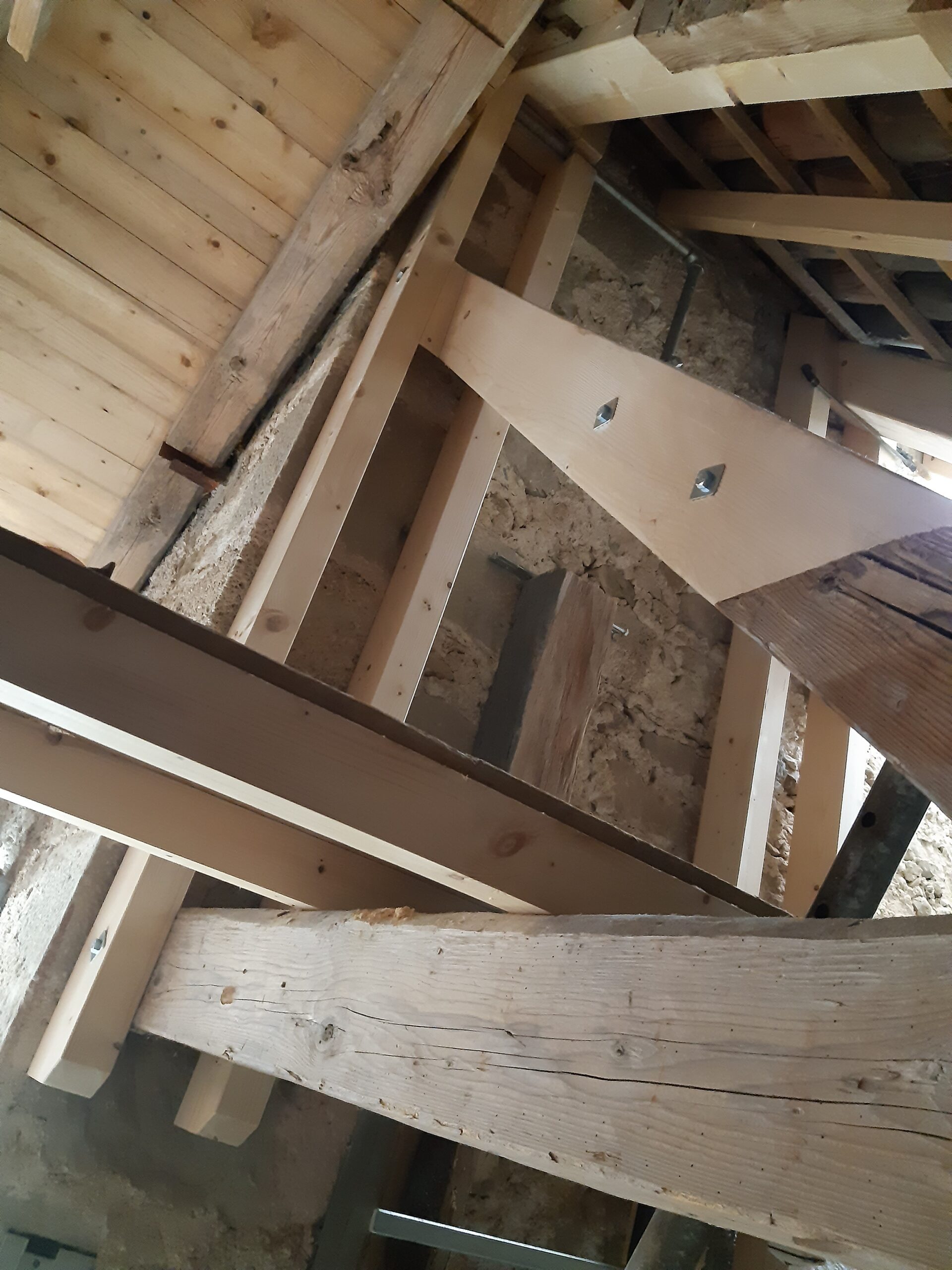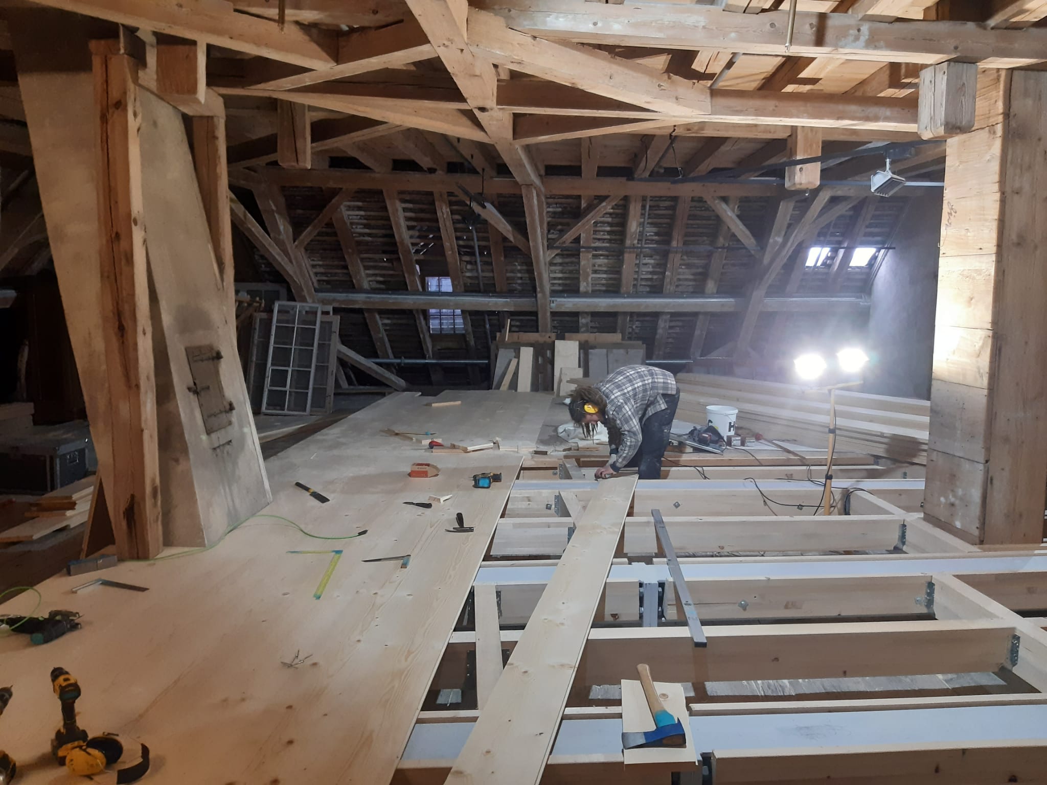 Ertüchtigung des Tragwerks. Bedachungsarbeiten und Sanierung in Zusammenarbeit mit der Denkmalpflege.