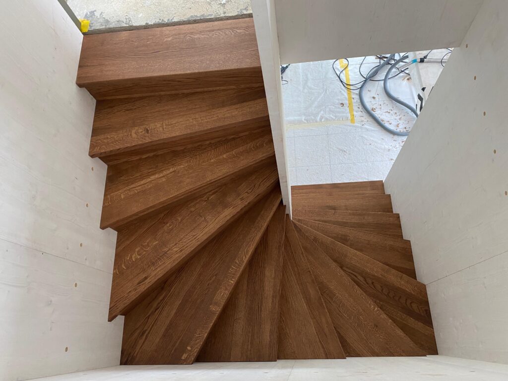 Halbewundene, aufgesattelte Treppe mit Eichentritten.